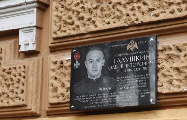 В Курске состоялось открытие мемориальной доски в память о старшем прапорщике полиции Олеге Галушкине, сотруднике ОМОН «Финист» Управления Росгвардии по Курской области, погибшем при исполнении служебного долга. Мемориальная доска установлена на фасаде Курского монтажного техникума имени Героя России Артура Лапшина, где учился Олег Галушкин.